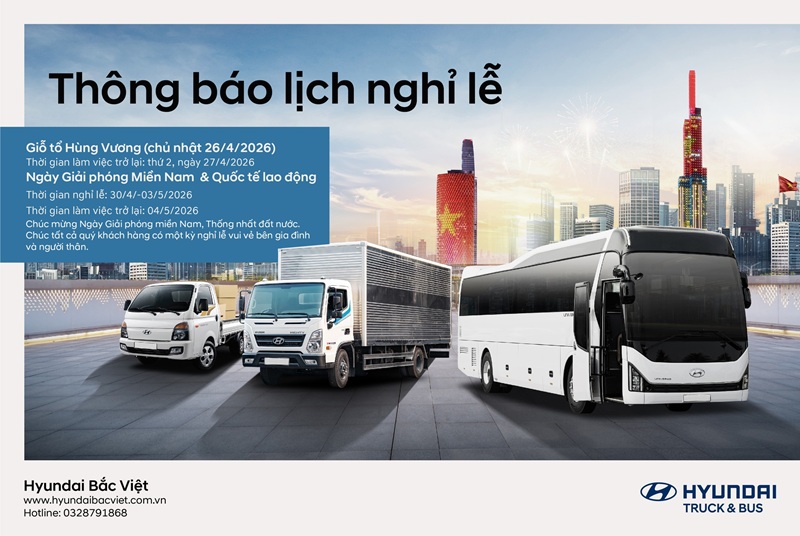 Nhằm giúp Quý đối tác và khách hàng thuận tiện trong việc sắp xếp kế hoạch làm việc trong dịp lễ sắp tới, Hyundai Bắc Việt trân trọng gửi đến Quý vị thông tin về lịch nghỉ lễ như sau: